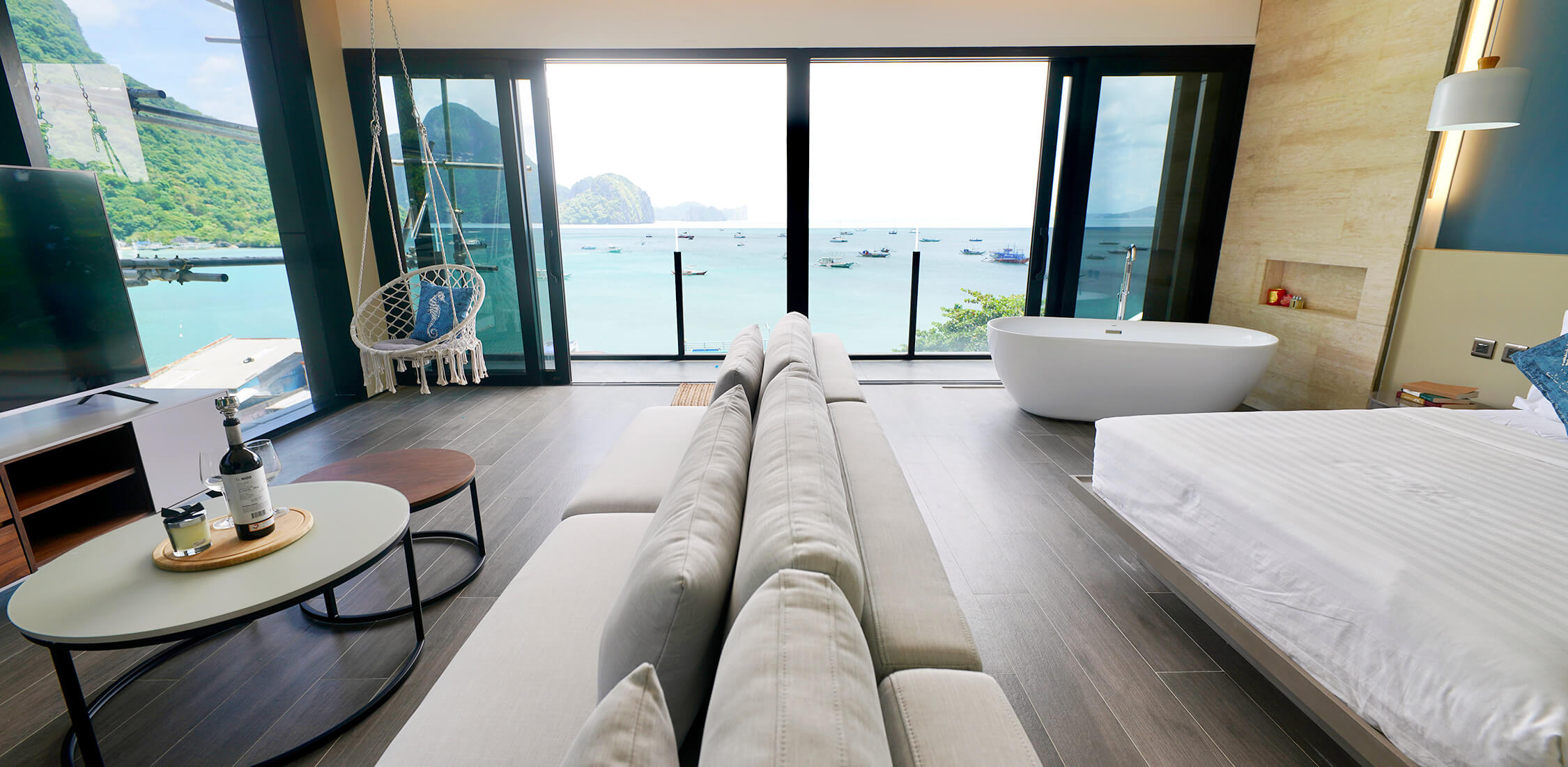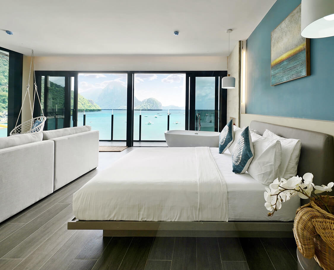 Welcome to the pinnacle of luxury at our Executive Room, where you’ll find yourself immersed in unparalleled comfort and style. Your expansive private balcony offers breathtaking panoramic views of El Nido Bay, making it the perfect spot to relax and unwind. The suite is tastefully decorated with laid-back sophistication, highlighted by a deep sunken tub that beckons you to stay just a little bit longer. With full unobstructed views of the natural splendor that surrounds you, this is a one-of-a-kind styling that will leave you in awe.