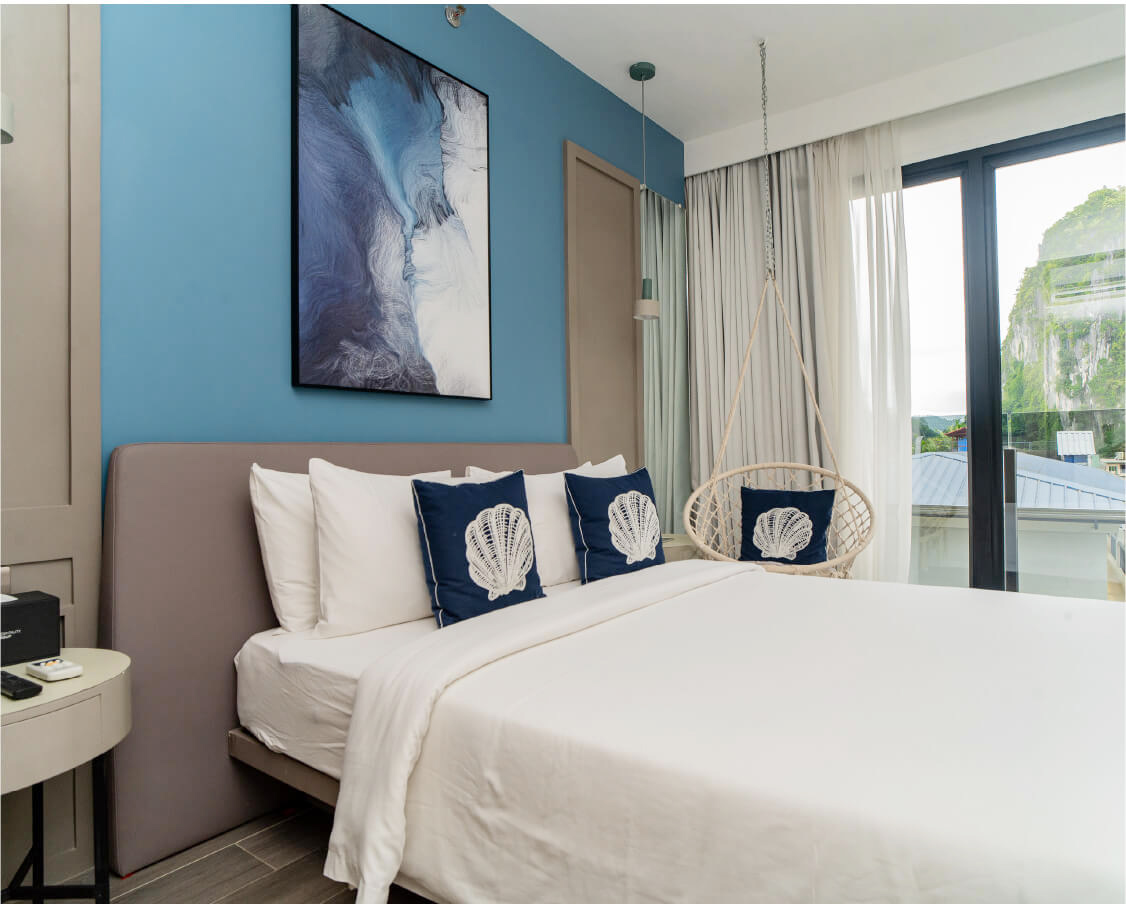 Behold the captivating view of the warmly lit streets of El Nido Town, set against the stunning backdrop of the towering limestone mountains. Admire this enchanting sight from the comfort of your spacious room through a large window, while enjoying the gentle tropical breeze that fills the air with the soothing fragrance of island life. Rest easy in your first-class deluxe double bed, and when it’s time for some peaceful slumber, the floor-to-ceiling blackout drapes provide ample respite from the sun’s rays.