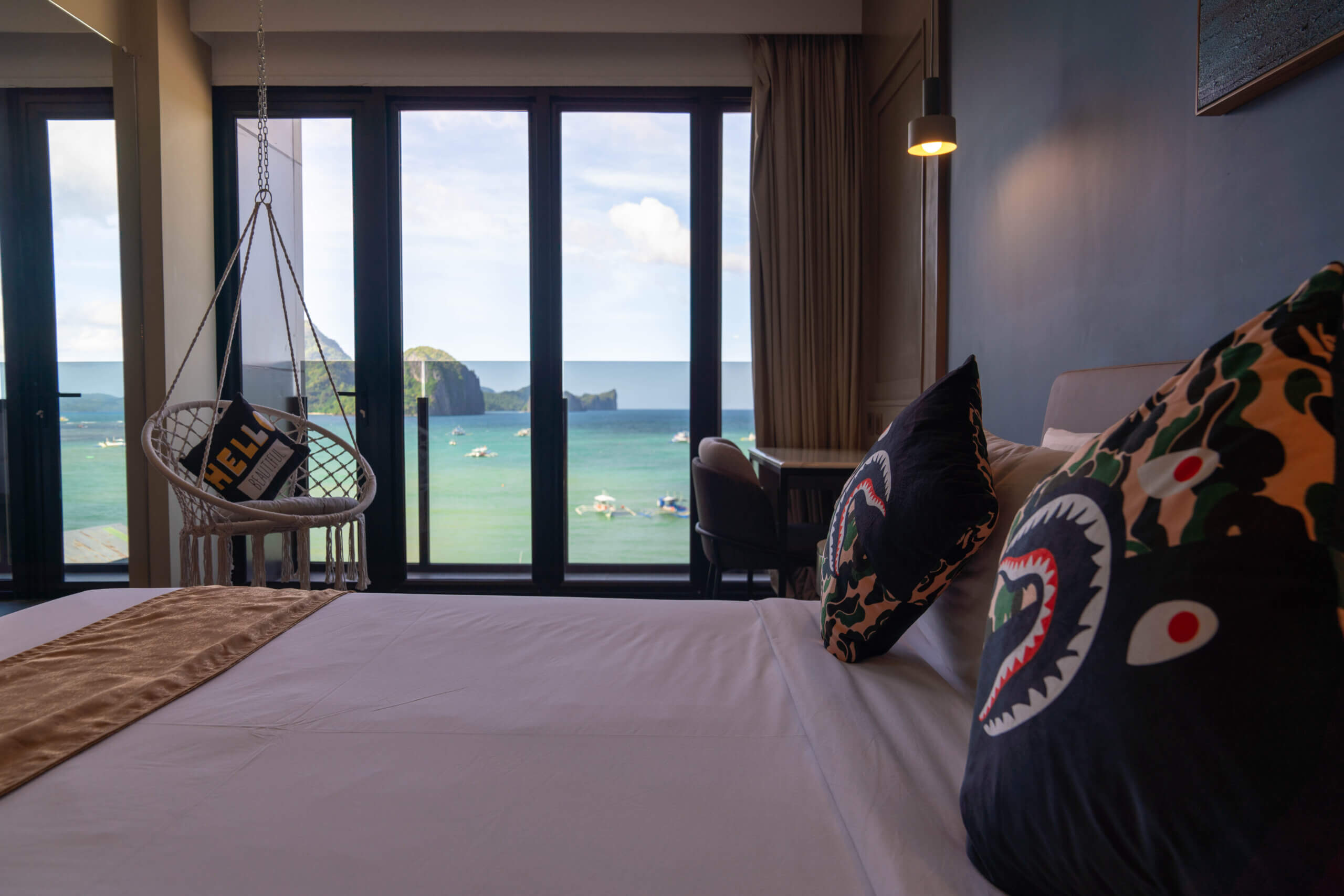 Indulge in the Deluxe Ocean View Rooms and awaken to a mesmerizing spectacle of El Nido Bay, gleaming in the gentle morning sun. The exquisite decor tastefully harmonizes with the natural hues of the turquoise waters below, creating a serene ambiance. The room is adorned with a premium double bed and a comfortable workspace, providing you with a vantage point to admire the panoramic views through the floor-to-ceiling windows.